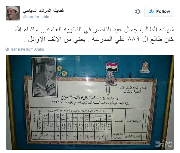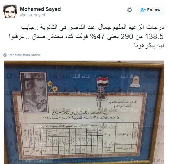 حالة من الجدل شهدتها مواقع التواصل الاجتماعي حول شهادة الرئيس الراحل جمال عبد الناصر في الثانوية العامة والتي كشفت تدني الدرجات في المواد التي كان يدرسها، حيث حصل على 49% .