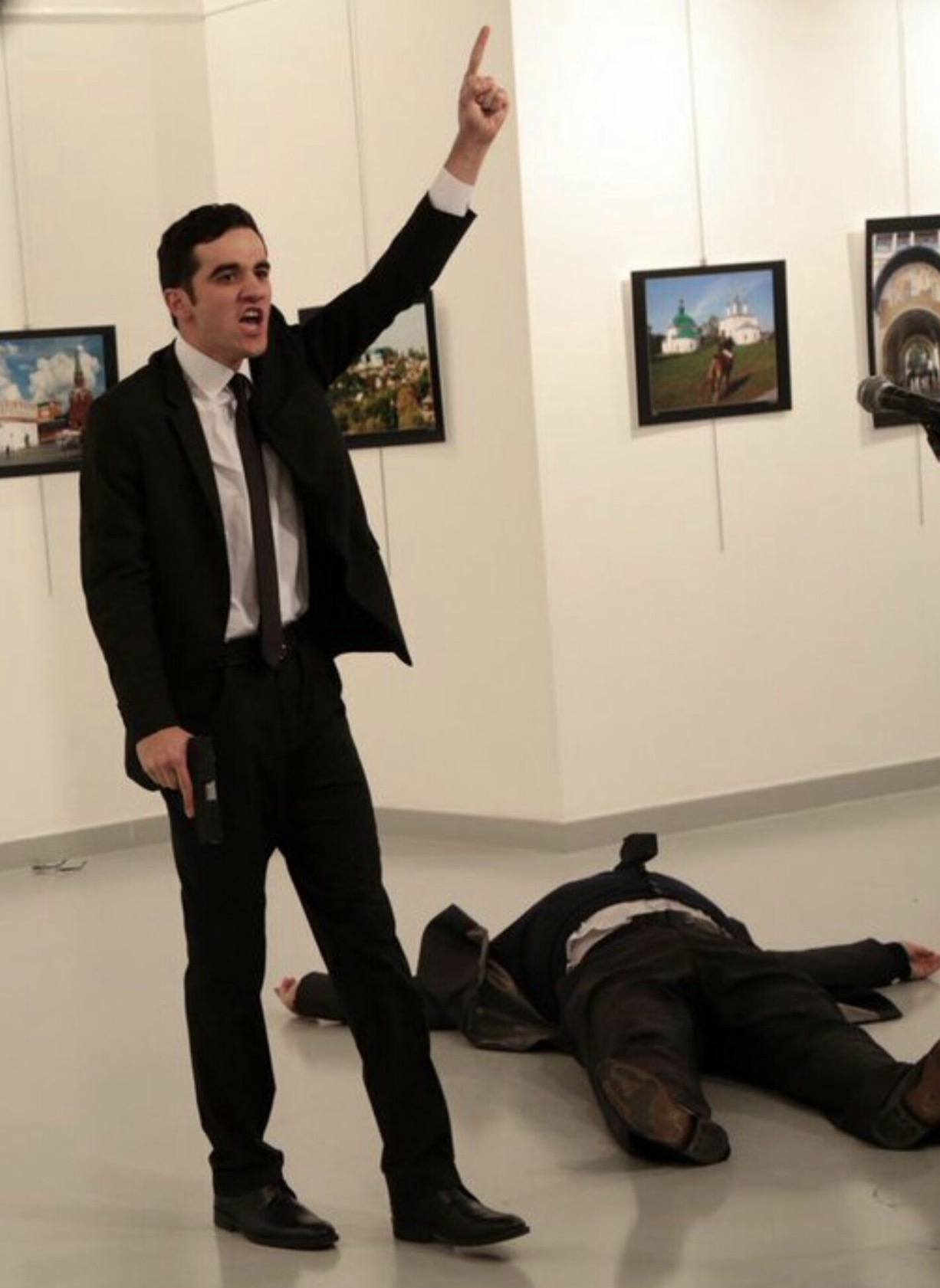 ​بعد أن استحوذ خبر مقتل السفير الروسي في أنقرة على الرأي العام في العالم أجمع، لفتت الصورة التي التقطها أحد المصورين لقاتل السفير وقتيله أنظار العالم، نظرًا لبراعة اللقطة وتصويرها، مما جعل البعض يصفها بصورة رائعة لمشهد تمثيلي محترف.