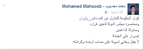 قال محسوب عبر منشور له علي صفحته الشخصية “فيس بوك”:” إقرار الحكومة للتنازل عن صنافير وتيران، ومحاصرة مجلس الدولة لتغيير قراره، ومغازلة الداعمين.. إصرار على الخيانة”.
