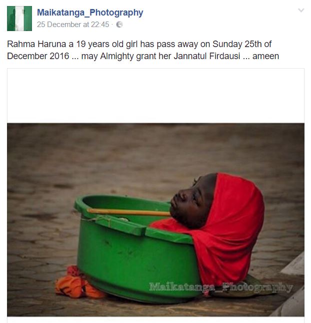 ونشر الصحفي النيجيري ساني مايكاتانغا، خبر وفاة “هارونا” على صفحته في موقع فيس بوك، داعيًا الله ان يرزقها جنة الفردوس.