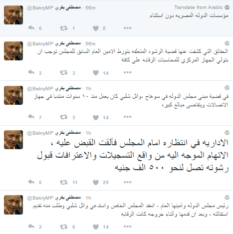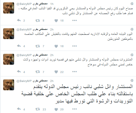 وأضاف عضو مجلس النواب ، أن “الرقابة الإدارية وجهت لأمين المجلس المستقيل اتهامات بقبول رشوة تصل لنحو 500 ألف جنيه، من واقع التسجيلات والاعترافات في قضية توريد أدوات وأجهزة وأثاث خاص لمبني مجلس الدولة في سوهاج”، مضيفًا: “الأمين المستقيل سبق له العمل منتدبا لجهاز وزارة الاتصالات ويتقاضى مبالغ كبرى”.