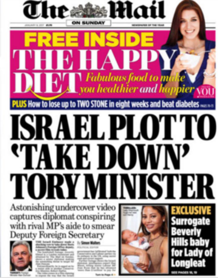 وخصصت جريدة “ميل أون صنداي” صفحتها الأولى بالكامل للفضيحة دون أن تضع معها أي خبر آخر، وعنونت تقول: “مؤامرة اسرائيلية لإسقاط وزير من حزب المحافظين”، فيما تجدر الاشارة الى أن “ميل أون صنداي” هي الصحيفة الأوسع انتشاراً والأكثر توزيعاً في بريطانيا من بين نظيراتها من صحف آخر الأسبوع.