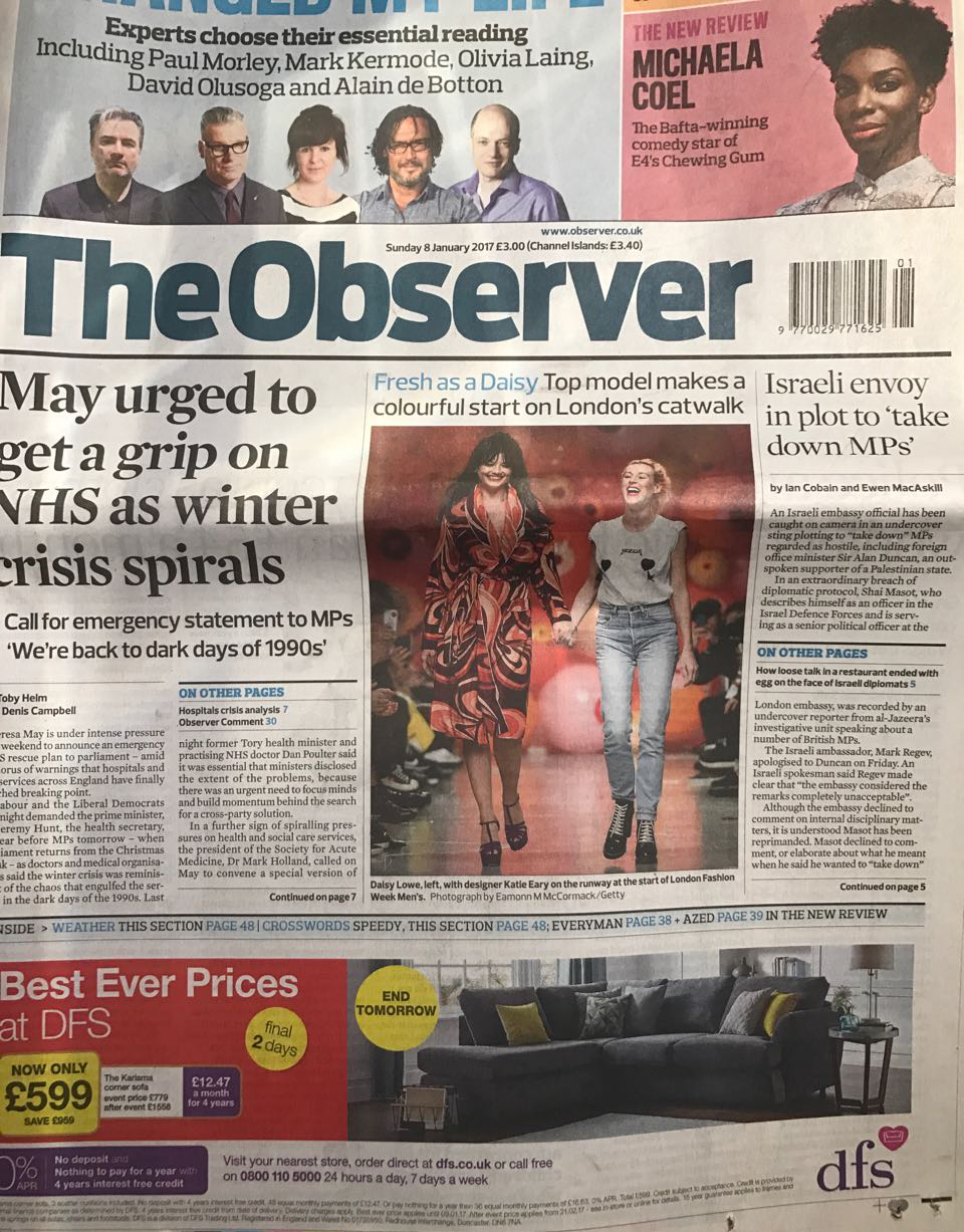 أما جريدة “أوبزيرفر”، وهي العدد الأسبوعي الذي يصدر كل أحد عن جريدة “الغارديان” المعروفة، فكتبت على صفحتها الأولى: “مبعوث إسرائيلي يتآمر لإسقاط نواب في البرلمان”، في إشارة الى وزير الشؤون الخارجية آلان دانكين، وهو عضو في البرلمان أيضاً عن حزب المحافظين الى كونه وزير في حكومة تيريزا ماي.