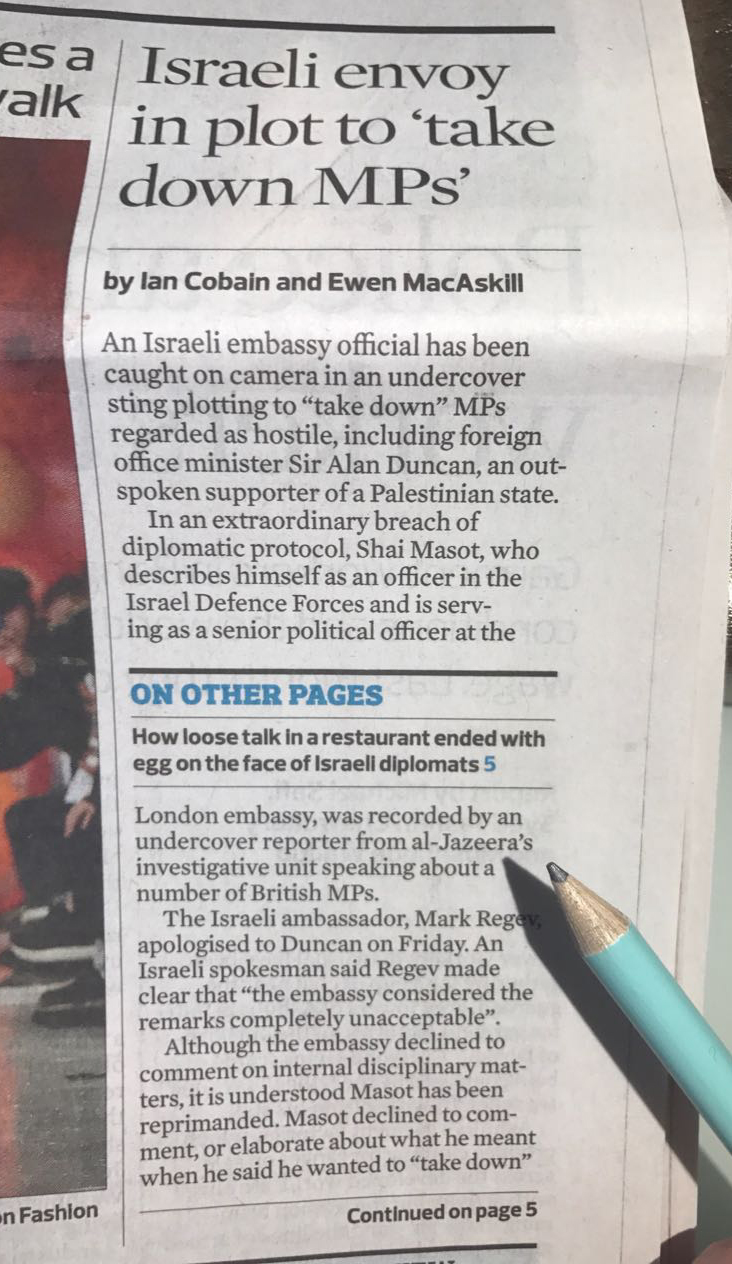 ونشرت جريدة “اندبندنت” التي تحولت الى صحيفة الكترونية تسجيل الفيديو على موقعها الالكتروني، وعنونت للفضيحة بالقول: “مسؤول في السفارة الاسرائيلية تم تصويره وهو يناقش كيفية إسقاط السير آلان دانكين وغيره من البرلمانيين البريطانيين المؤيدين للشعب الفلسطيني”.