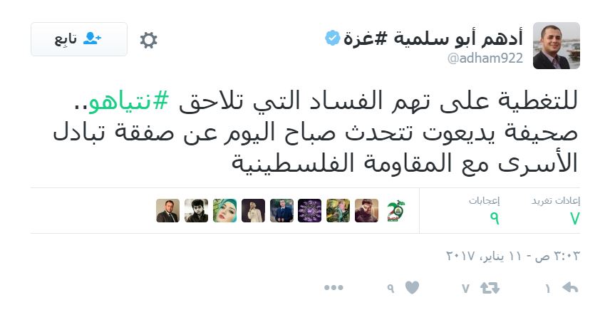 وقال “أبو سلمية” في تغريدة له على موقع “تويتر”: “للتغطية على تهم الفساد التي تلاحق نتياهو.. صحيفة يديعوت تتحدث صباح اليوم عن صفقة تبادل الأسرى مع المقاومة الفلسطينية”.