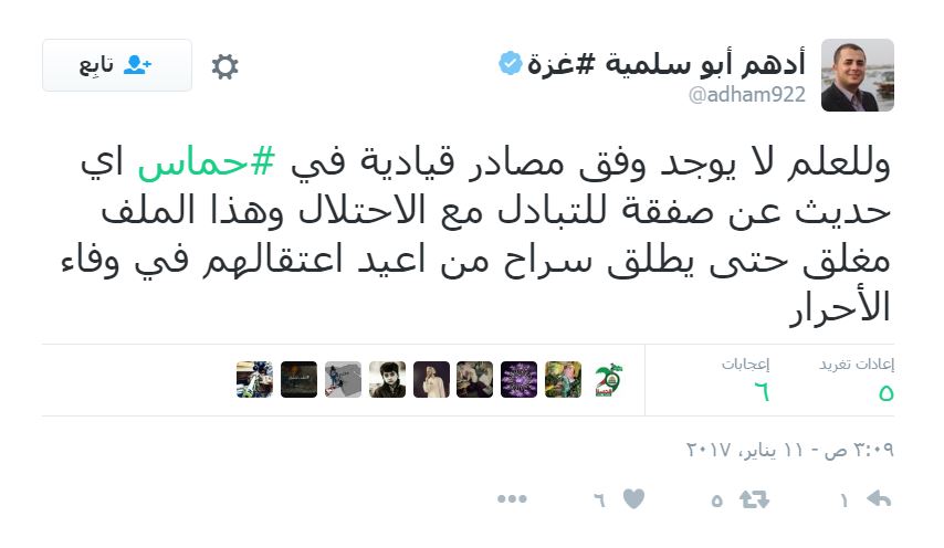 وأضاف: “وللعلم لا يوجد وفق مصادر قيادية في حماس أي حديث عن صفقة للتبادل مع الاحتلال وهذا الملف مغلق حتى يطلق سراح من أعيد اعتقالهم في وفاء الأحرار”.