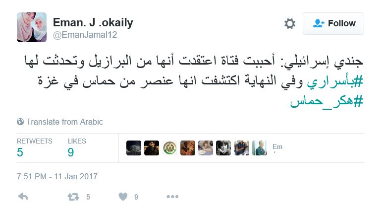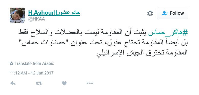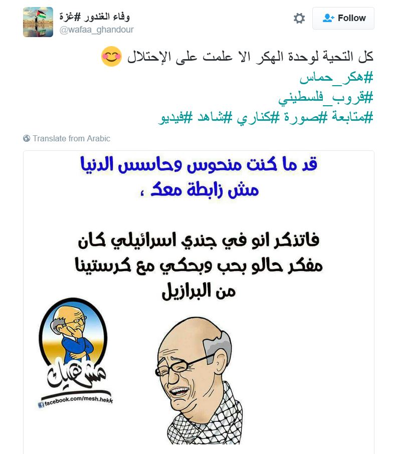 ودشن رواد مواقع التواصل هاشتاج باسم “هكر حماس”، عبروا فيه عن دعمهم وإعجابهم بأفكار القسام في محاربة العدو، ساخرين من الجنود اليهود الذين أسرعوا بالافصاح عن المعلومات لفتيات تعرفوا عليهن من خلال صفحات الفيس بوك.