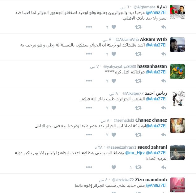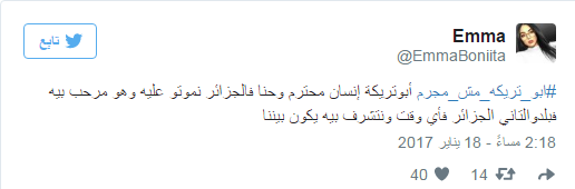 ومن جانبه، قال محمد الأمين بن شابير الصحفي بقناة الهداف الجزائرية في تصريح صحفي” عن دعوة أبو تريكة للانتقال إلى الجزائر”، إن ما قامت به السلطات المصرية لا يهمني من قريب أو بعيد، وأفضل ألا أعلق عليه، وبخصوص محمد أبو تريكة، يبقى محبوب الجماهير العربية كلها، وخاصة الجزائريين، فهو يحظى بمكانة كبيرة في قلوب كامل الشعب الجزائري “.