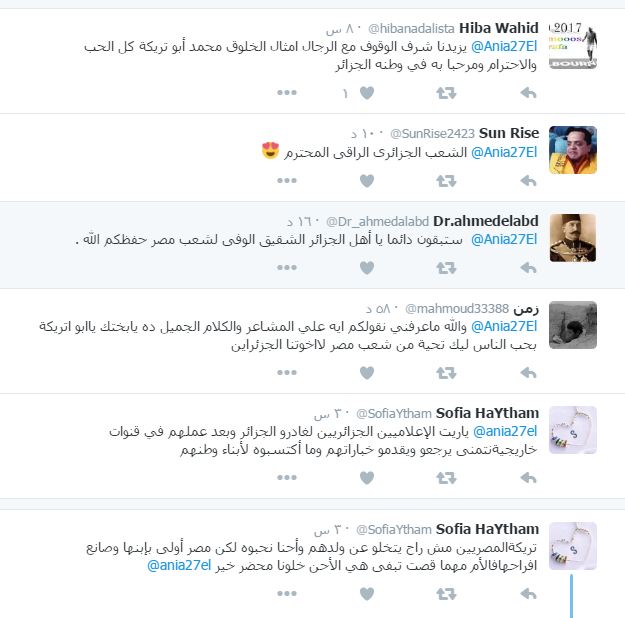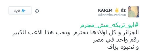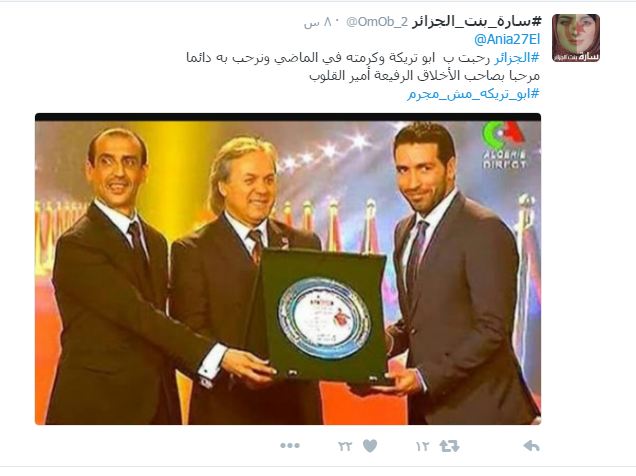 وتابع “كجزائري أعرف مكانة محمد أبو تريكة في قلوب الجزائريين أكبر مما تتخيل، أذكر في لقاء الجزائر ومصر، الأول في 2009 في ملعب مصطفى شاكر، الكثير من الجماهير الجزائرية انتظرت حافلة المنتخب المصري، بعد نهاية اللقاء، فقط لكي تحيي أبو تريكة، وأهدوه الورود، والتقطوا معه الصور”.