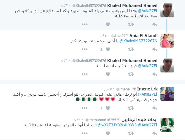 وتضامن آلاف الجزائرين مع “أبو تريكة”، وتفاعلوا مع دعوة الإعلامية مطالبين اللاعب باللجوء إلى بلادهم، وأن يعتبرها بلاده الثاني.