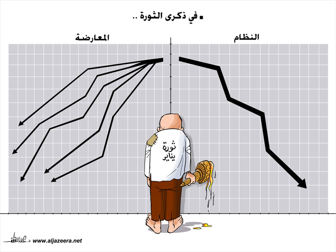 ونشرت “الجزيرة” كاريكاتيرا مع اقتراب ذكرى ثورة يناير، يصف الحال الذي عليه المعارضة وتمزقها أمام النظام الحالي.