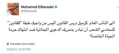قال البرادعي، عبر”تويتر”:”الى النائب العام :كزميل درس القانون أليس من واجبك طبقا “للقانون” كمحامي الشعب أن تبادر بتحريك الدعوى الجنائية ضد انتهاك حرمة الحياة الخاصة؟”