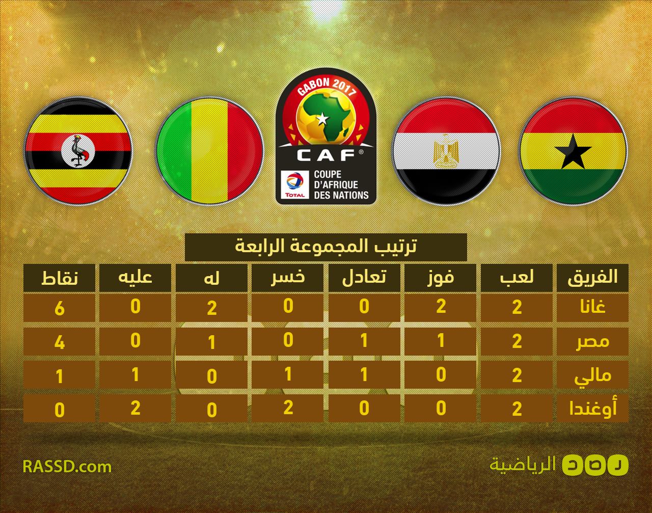 فوز المنتخب الوطني اليوم هو الأول له في البطولة، حيث رفع رصيده إلى 4 نقاط في المركز الثاني من جدول المجموعة الرابعة، وبفارق نقطتين عن غانا التي تأهلت اليوم إلى دور ربع النهائي، بينما تجمد رصيد أوغندا بلا نقاط، ليودع المنتخب منافسات البطولة، في حين يأتي منتخب مالي في المركز الثالث بنقطة واحدة.