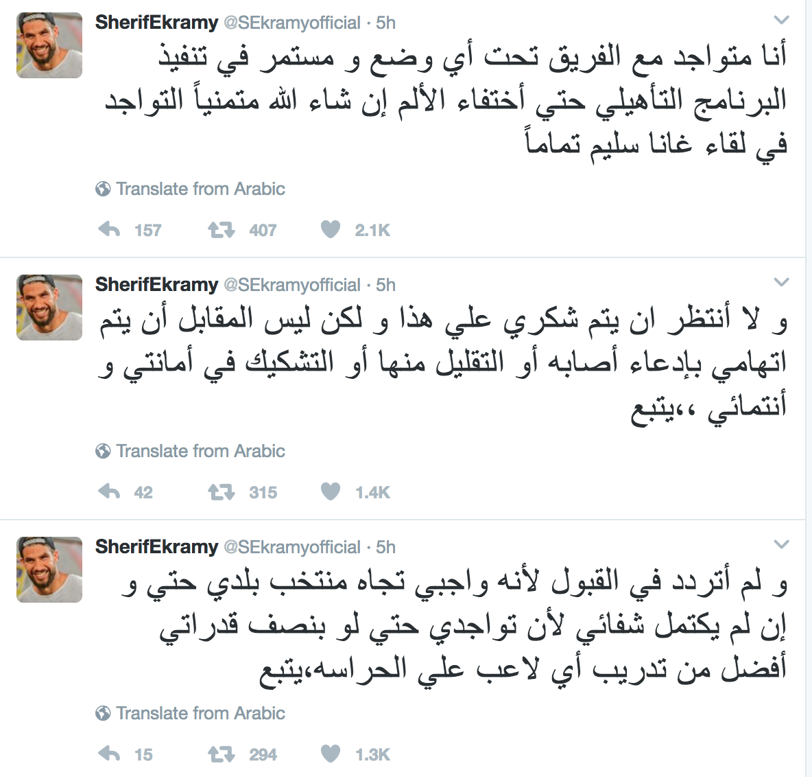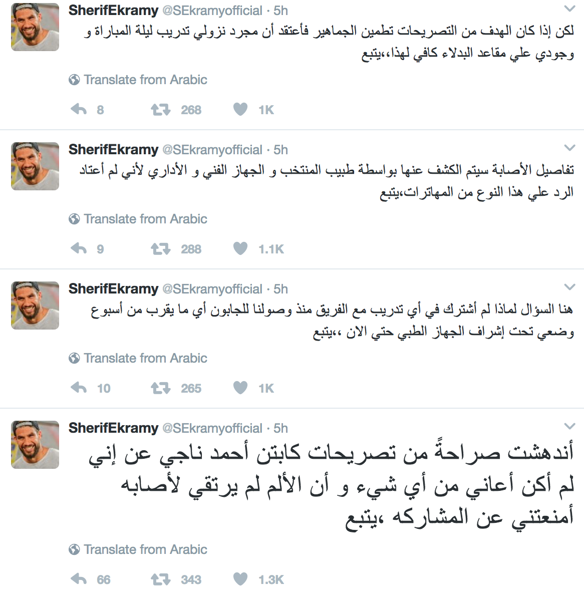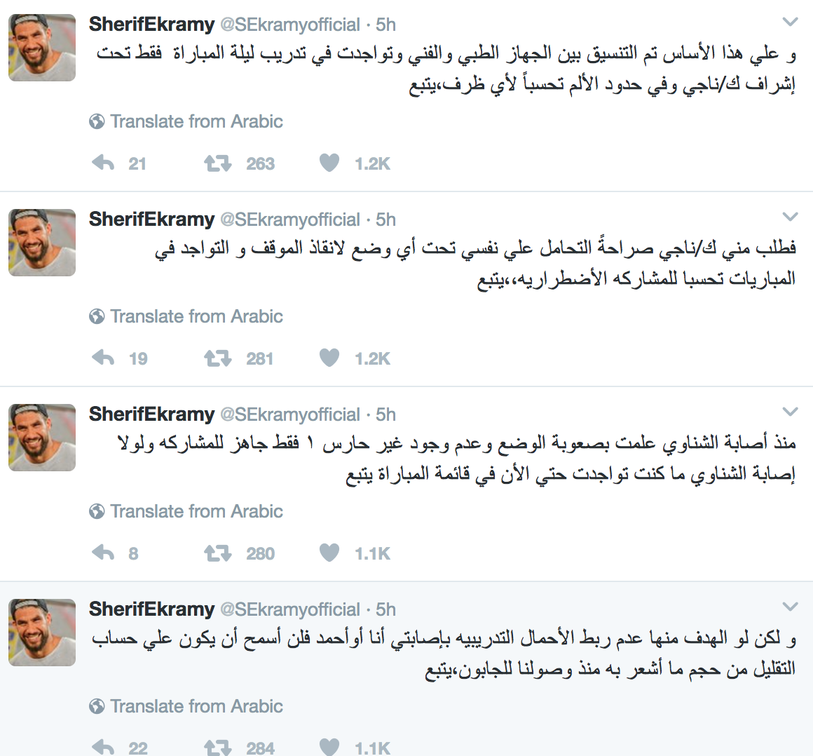 وكتب إكرامي :”اندهشت صراحةً من تصريحات كابتن أحمد ناجي عن إني لم أكن أعاني من أي شيء و أن الألم لم يرتقي لإصابه أمنعتني عن المشاركه”.