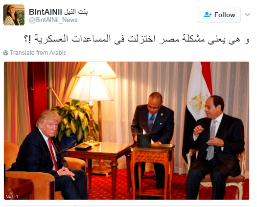 أثار إعلان الرئيس الأمريكي دونالد ترامب ملتزم بالمساعدات العسكرية لمصر، الجدل على موقع التدوين العالمي “تويتر”وكان ترامب قد ألمح أنه سيعيد النظر في الاعتمادات المالية الخاصة بوزارة الخارجية الأمريكية التي حصلت على اعتماد 50 مليار دولار من إدارة أوباما العام الجاري، مشيرا إلى أن تلك الأموال سيتم إنفاقها في دول العالم الخارجية لتأكيد التواجد الأمريكي في الخارج ودعم المصالح الأمريكية بتقديم مساعدات اقتصادية وعسكرية وإنسانية لدول أخرى.