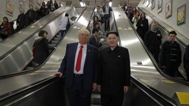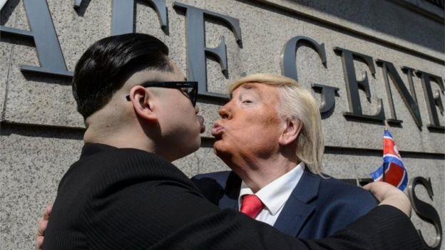 وتبادل الرئيسان المزيفان، العناق والقبلات، أثناء مرورهم في أكثر الشوارع ازدحامًا في المدينة، بعد أن أثنى كل منهما على الآخر في مشهد هزلي لا يمكن أن يصدق حدوثه بين ترامب و “كيم كونج”.