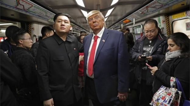 لفت ظهور الرئيسين ” دونالد ترامب” و”كيم كونج”، المارة في شوارع هونج كونج، قبل أن يتضح أن الشخصيتين هما موسيقيين، تنكرا في هيئة الرؤساء للإعلان عن أغنية جديدة عن السنة القمرية.