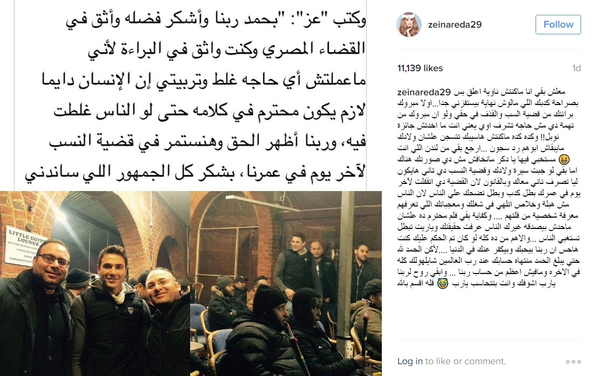 وكتبت زينة عبر صفحتها الشخصية على موقع إنستجرام” معلش بقي انا ماكنتش ناوية اعلق بس بصراحة كدبك اللي مالوش نهاية بيستفزني جدا…اولا مبروك براءتك من قضية السب والقذف في حقي ولو ان مبروك من تهمة دي مش حاجه تشرف اوي يعني انت ما اخدتش جائزة نوبل!! وكده كده ماكنتش هاسيبك تتسجن علشان ولادك مايبقاش ابوهم رد سجون”.