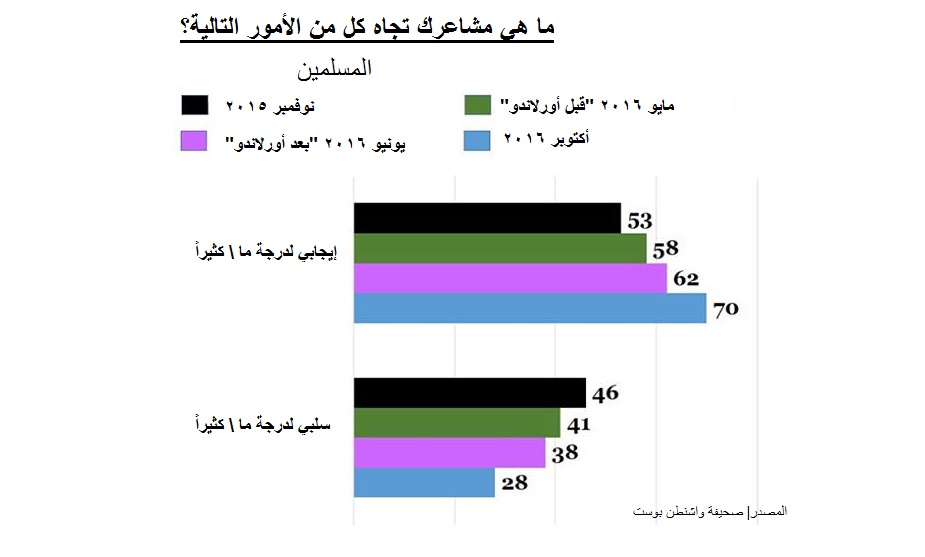 أشارت أربعة استطلاعات للرأي أُجريت في العام الماضي إلى تحول مذهل وغير متوقع، ولا يمكن تفسيره من خلال أحداث العام الماضي في وجهة نظر الأمريكيين تجاه المسلمين؛ إذ ارتفعت نسبة قبولهم للمسلمين من 53% في نوفمبر من العام 2015 إلى 70% في أكتوبر 2016.