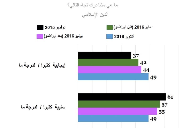 حتى المشاعر تجاه الإسلام نفسه، التي عادة ما تكون أقل إيجابية من المشاعر تجاه المسلمين أظهرت تحسُّنًا مثيرًا لترتفع من 37% في نوفمبر 2015 إلى 49% في أكتوبر 2016، وهي أعلى نسبة قبول منذ أحداث الحادي عشر من سبتمبر.