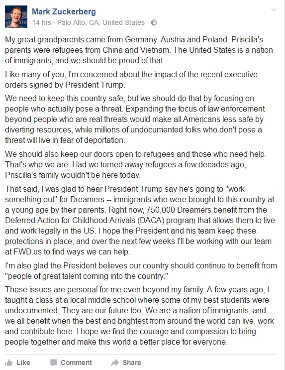 وقال زوكربرج في تدوينة له على موقعه: “أجدادي ينحدرون من ألمانيا والنمسا وبولندا، أما (زوجتي) بريسكيلا، فكان والداها لاجئين من الصين وفيتنام.. الولايات المتحدة أمة مهاجرين، وعلينا أن نكون فخورين بذلك”.