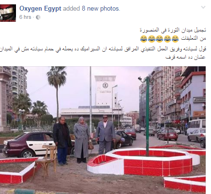 سخر رواد موقع التواصل الاجتماعي “فيس بوك”، خاصة أبناء محافظة المنصورة منهم، من عملية تجميل ميدان الثورة بحي شرق المنصورة، إذ رأوا أن الألوان المستخدمة تناسب أكثر أن توضع في “حمام” أو “مراحيض عامة”، وأنها لا تمت بصلة لأي مظهر حضاري أو جمالي.