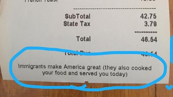 وقرر مسؤول المطعم، مارك سيمنز، طباعة رسالة على الفواتير كتب فيها: “المهاجرون يصنعون عظمة أمريكا، هم أيضًا من حضّروا طبقكم وتولوا خدمتكم اليوم”.