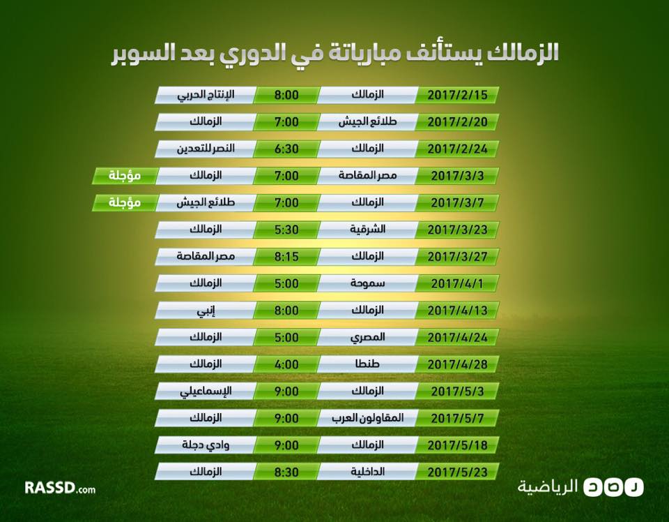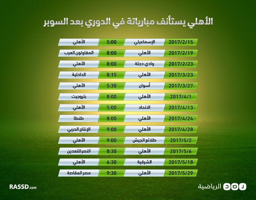 فيما يلي، أعدّ موقع “رصد” لمتابعيه جدولًا بمواجهات الفريقين في الدوري المصري خلال الشهر الحالي فبراير والأشهر الثلاثة القادمة (مارس وأبريل ومايو):