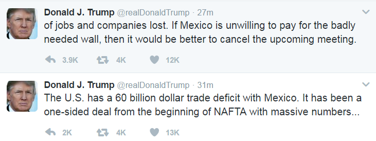 ورد  بينا نييتو، على تغريدة ترامب معلنًا أن المكسيك لن تدفع تكالف هذا الجدار.
