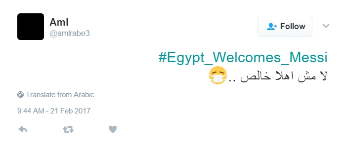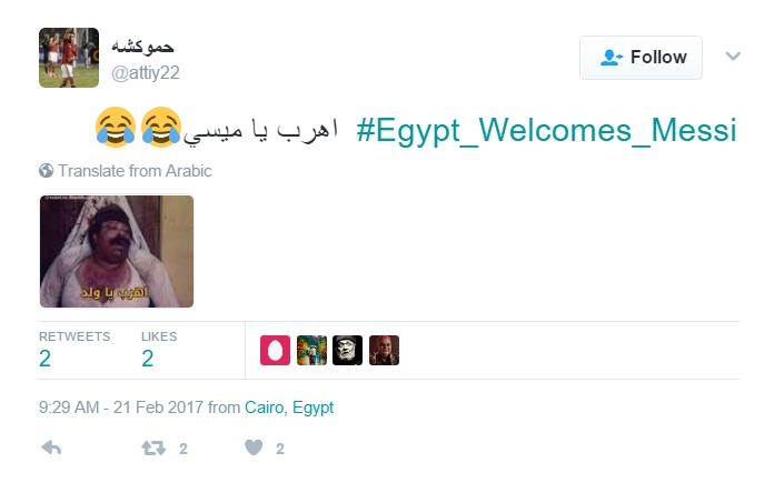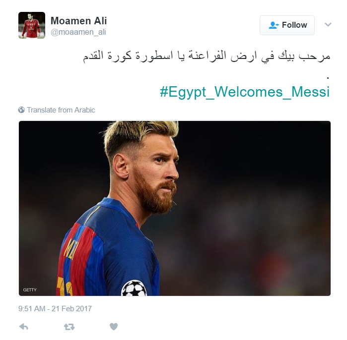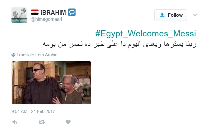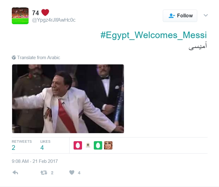 ودشن رواد موقع التدوينات الصغير “تويتر” هاشتاج باسم ” #egypt_welcomes_messi”، للترحيب باللاعب على أرض مصر، ليتصدر قائمة الأوسمة الاكثر انتشارًا في مصر.