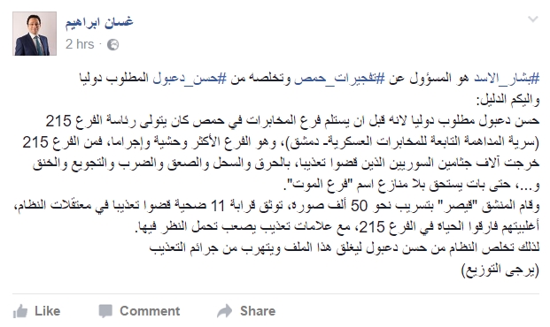 وكتب إبراهيم عبر حسابه على موقع “فيس بوك”، قائلًا: “بشار الأسد هو المسؤول عن تفجيرات حمص وتخلصه من حسن دعبول المطلوب دوليا، وإليكم الدليل”.