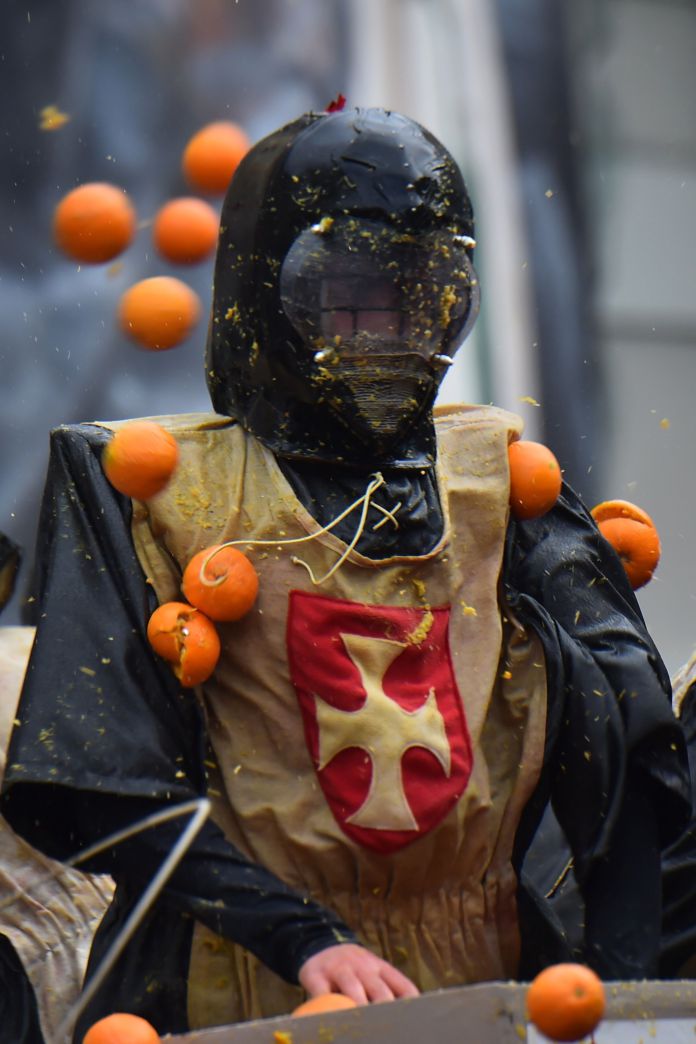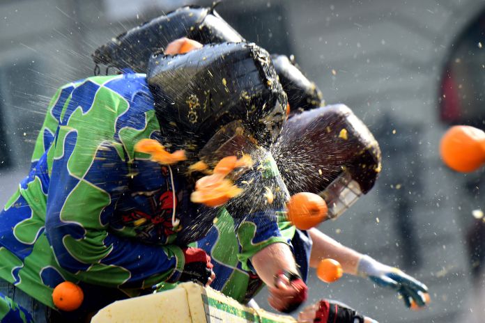 تشهد مدينة “إيفرا” الإيطالية، هذه الأيام حربا دائرة بين سكانها، ولكنها ليست بالأسلحة وإنما بـ”البرتقال”، فخلال الفترة من 25 فبراير وحتى 28 فبراير، يقوم المشاركون بالتراشق بالبرتقال في شوارع المدينة.