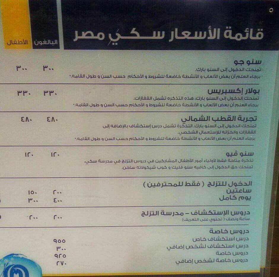 وتتراوح أسعار تذاكر الدخول من 300 جنيه للكبار والأطفال، حتى 955 جنيهًا؛ تشمل دروس تعليم التزلج.