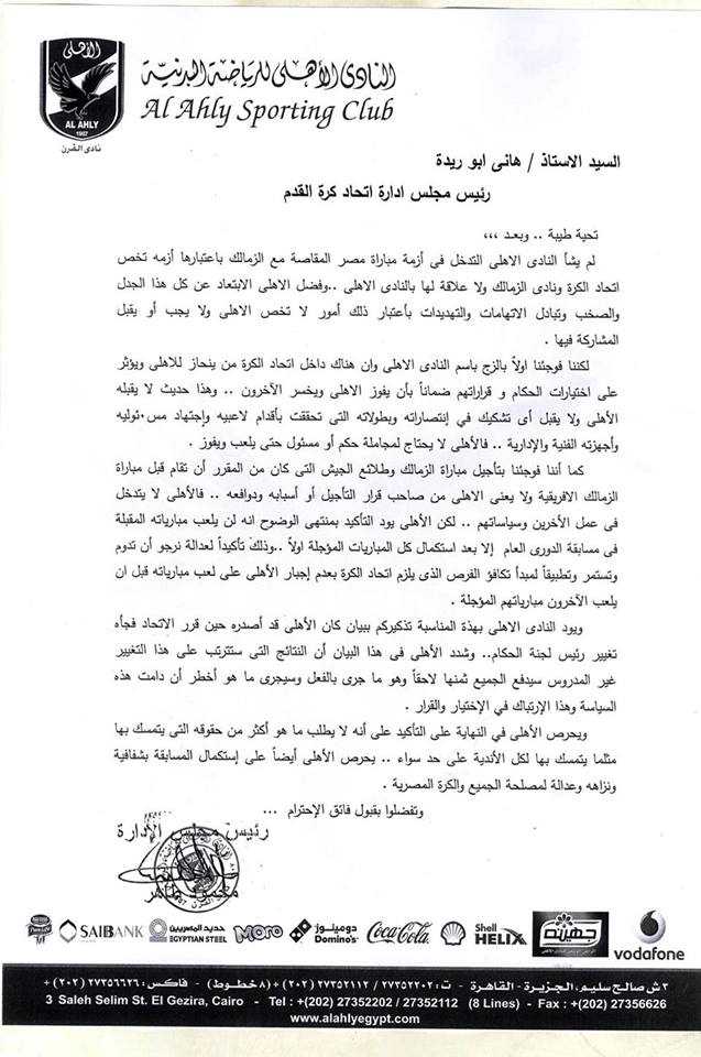 وأرسل محمود طاهر البيان إلى هاني أبو ريدة، رئيس اتحاد الكرة، يؤكد فيه عدم خوض الأهلي مبارياته المقبلة في الدوري إلا بعد استكمال جميع الفرق مبارياتها المؤجلة؛ لإرساء مبدأ تكافؤ الفرص.