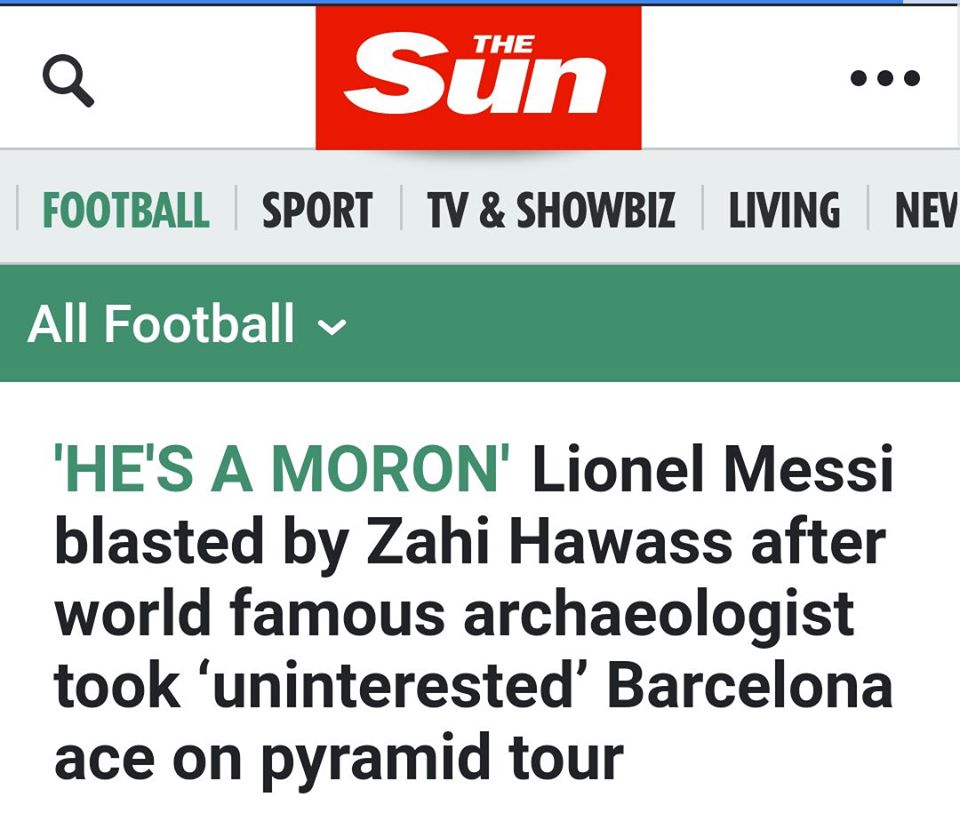 أبرزت عديدٌ من الصحف العالمية تصريحات وزير الآثار الأسبق زاهي حواس بشأن النجم العالمي ليونيل ميسي، لاعب برشلونة الإسباني، وزيارته إلى الأهرامات؛ بعد وصْفِ حواس لميسي بـ”الأهبل” في مداخلة هاتفية مع أحد البرامج التلفزيونية.