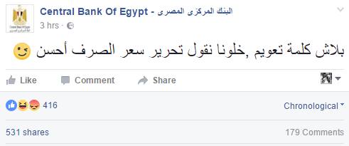 ونشر حسابٌ على “فيس بوك” يحمل اسم البنك المركزي المصري منشورًا يطالب المواطنين بعدم استخدام كلمة “تعويم الجنيه”، وقال: “خلونا نقول (تحرير) سعر الصرف أحسن”؛ ما تسبب في موجة سخرية واسعة في التعليقات.