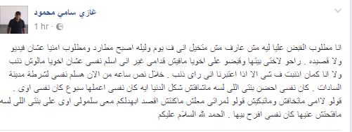 وقال سامي: “أنا مطلوب القبض عليا ليه مش عارف، مش متخيل إني في يوم وليلة أصبح مطارد ومطلوب أمنيا عشان فيديو ولا قصيدة، راحو لاختي بيتها وقبضو على أخويا مافيش قدامي غير إني أسلم نفسي عشان أخويا مالوش ذنب ولا أنا كمان أذنبت في شئ إلا إذا اعتبرنا إنى رأيي ذنب. خلال نص ساعه من الآن هسلم نفسي لشرطة مدينة السادات، كان نفسي أحضن بنتي اللي لسة ماشافتش شكل الدنيا إيه، كان نفسي أعملها سبوع، كان نفسي أوي. قولوا لأمي ماتخافش وماتبكيش، قولو لمراتي معلش ماكنتش أقصد أبهدلكم معي سلمولي أوي على بنتى اللى لسه مافتحتش عنيها كان نفسى افرح بيها . الحمد لله السلام عليكم”.