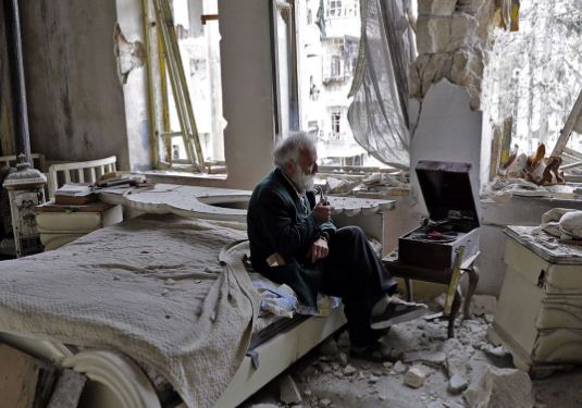 على الرغم من تكسر نوافذ الشقة والحوائط؛ فإن محمد محيي الدين جلس في غرفته بسلام وهو يدخن سيجارته ويستمع إلى الموسيقى في غرفته المدمرة في حلب بسوريا.