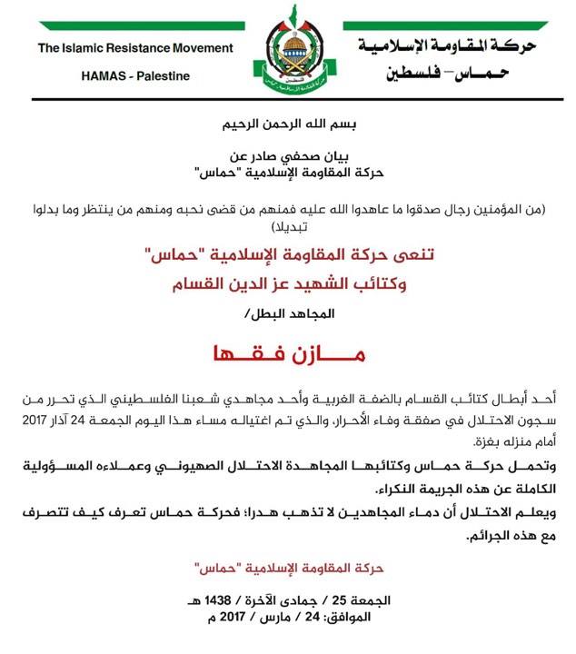 نعت حركة المقاومة الإسلامية “حماس” وكتائب الشهيد عز الدين القسام الشهيد مازن فقها، الذي اغتيل مساء الجمعة أمام منزله بغزة، وحمّلت الاحتلال وعملاءه المسؤولية الكاملة عن هذه الجريمة النكراء، مؤكدة أنها لن تمر دون حساب.