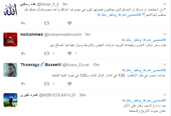 دشن رواد موقع التدوينات المصغرة "تويتر" وسم "السيسي دمرها وتاجر بآثارها"، رفضا لما آلت اليه الأحوال الاقتصادية.