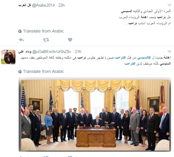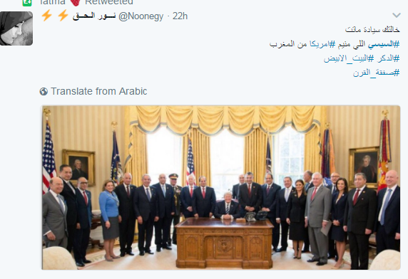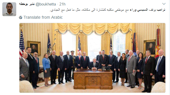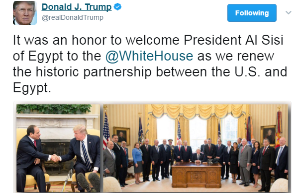 تداول رواد مواقع التواصل الاجتماعي صورة نشرها الرئيس الأميركي دونالد ترامب عبر حسابه بموقع التدوين العالمي “تويتر” من داخل البيت الأبيض، ظهر فيها عبدالفتاح السيسي يقف خلفه مثل باقي الحضور، بينما يجلس ترامب أمامهم؛ الأمر الذي اعتبروه “إهانة لمصر”.