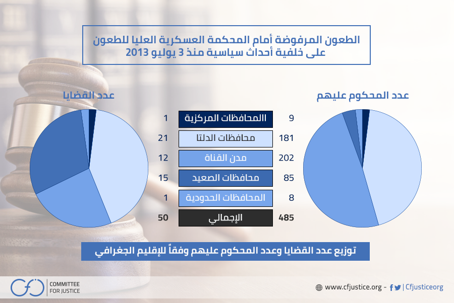 ويبيّن التقرير، من خلال اعتماده على دراسة 50 قضية استنفذت إجراءات التقاضي كافة وأصبحت أحكامها باتة وواجبة النفاذ تمت بسببها إحالة 485 مدنيًا في الفترة بين 30 يونيو 2013 ونهاية ديسمبر 2016 إلى المحاكم العسكرية، كيف تم التعدي عليهم وحرمانهم تعسفيًّا من حريتهم نتيجة ممارسة انتهاكات قانونية وتشريعية وإهدار للحق في المحاكمة العادلة.