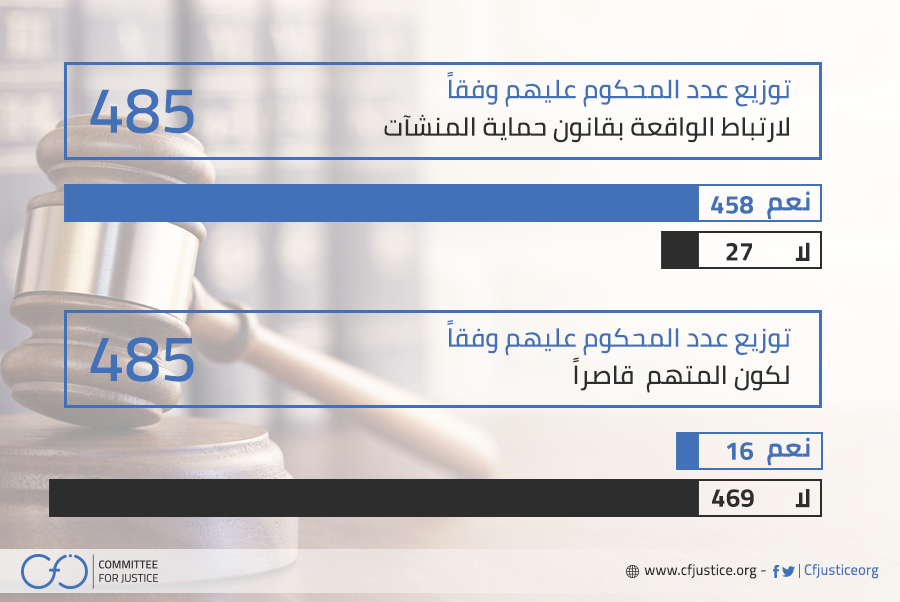 وتظهر الدراسة أيضًا أن عدد المحكومين لارتباط واقعة القضية بقانون حماية المنشآت 458 من 485 المشمولين في الدراسة، وأن عدد القُصّر 16 محكومًا. وكان الحكم غيابيًا بحق 274 من المتهمين وحضوريًا على 174 منهم.