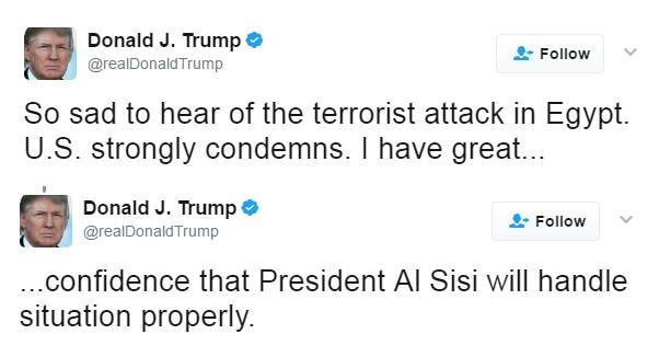 وأضاف ترامب، عبر تغريدتيْن بصفحته على موقع التواصل “تويتر”، أنه “حزين لسماع الأخبار حول الحادث الإرهابي في مصر والذي تدينه الولايات المتحدة بشدة. أنا على ثقة تامة أن الرئيس السيسي سيعالج الموقف بشكل جيد“.