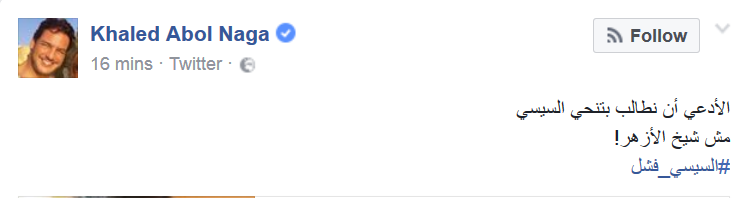 وقال في تدوينة عبر حسابه الرسمي على موقع التواصل الاجتماعي “فيس بوك”: “الأدعى أن نطالب بتنحي السيسي، مش شيخ الأزهر، السيسي فشل”.