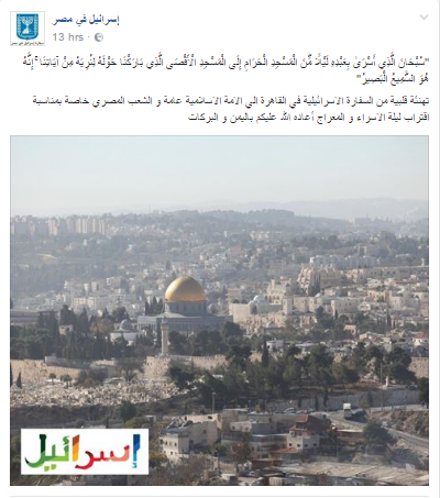 وقالت السفارة عبر صفحتها الرسمية على “فيس بوك”: “تهنئة قلبية من السفارة الإسرائيلية في القاهرة إلى الأمة الإسلامية عامة والشعب المصري خاصة بمناسبة اقتراب ليلة الاسراء والمعراج. أعاده الله عليكم باليمن والبركات”.