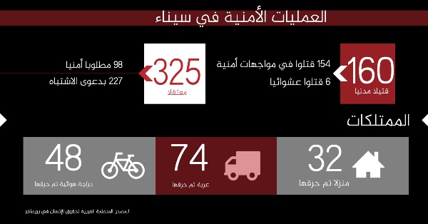 وعلى مستوى العمليات الأمنية في سيناء، قتلت القوات المصرية هناك 160 مواطنًا مدنيًا؛ منهم 154 قتلوا في مواجهات أمنية وستة بشكل عشوائي. وبلغ عدد المعتقلين في سيناء خلال هذه الفترة 325؛ منهم 98 مطلوبًا أمنيًا و227 شخصًا بدعوى الاشتباه.