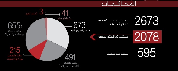 وتنوّعت الأحكام التي صدرت ما بين 41 حكمًا بالإعدام و673 بالسجن المؤبد و655 بالسجن بين شهر وثلاث سنوات، و491 بالسجن أكثر من خمس سنوات، فضلًا عن 215 بالسجن بين ثلاث سنوات وخمس.