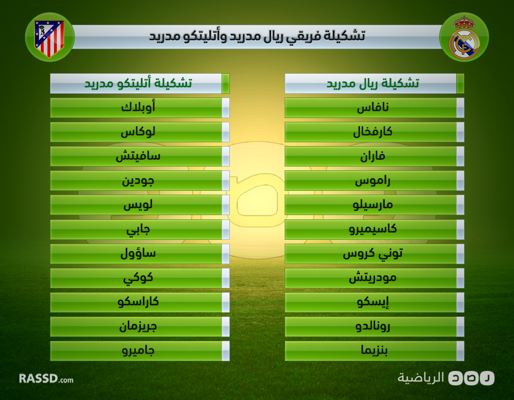 أعلن فريقا ريال مدريد وأتليتكو مدريد، مباراتهما التي تبدأ بعدقليل، والتي يستضيفها الملكي على أرضه في ذهاب نصف نهائي دوري أبطال أوروبا على ملعب “سنتياجو برنابيو”.
