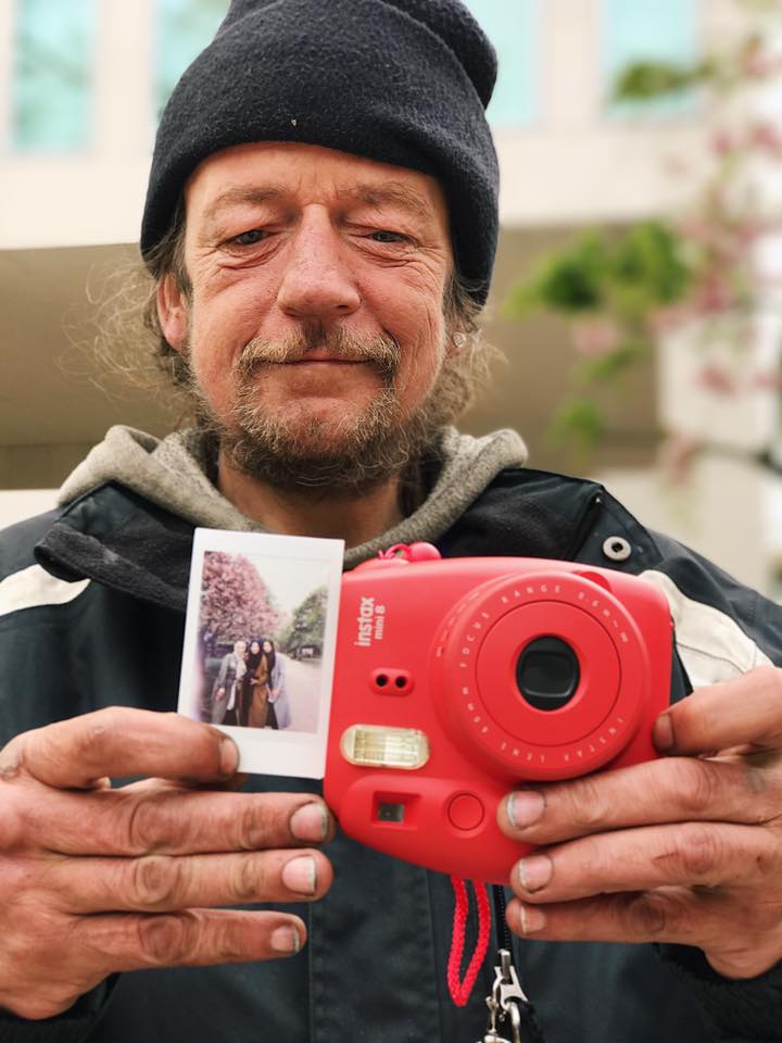 وقالت “ثم ذهبنا لمحل مستلزمات ورقية واشترينا لوحة فارغة وأقلام ملونة وغطاء بلاستيكي للوحة ففي لندن تكثر الأمطار، وكتبنا على اللوحة: “هل تريد صورة فورية؟ أنا مصور بلا مأوى، ادعمني 🙂  ٥ باوند/للصورة” وأضافت “وعدنا للحديقة وقلوبنا تسبق أقدامنا لمفاجأته ورسم السرور على قلبه، ولكن لم نجد أندرو”.
